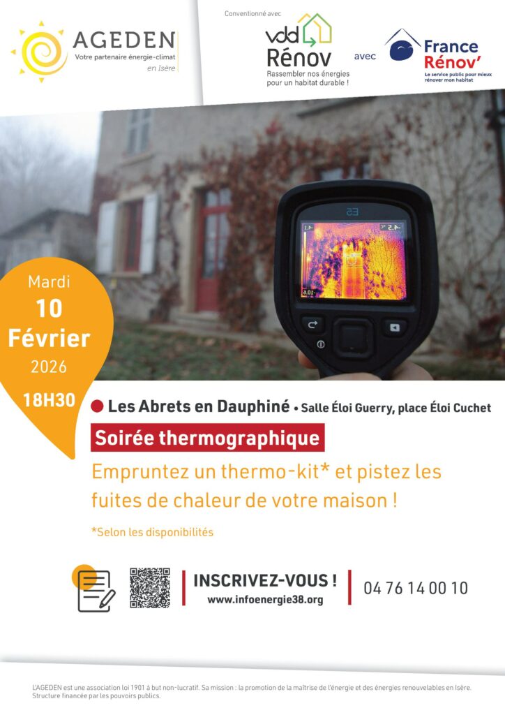 À la fin de cette soirée, vous pourrez vous inscrire pour emprunter un thermo-kit pour passez votre maison au peigne fin ! Cette mallette contient une caméra thermique permettant de pister les fuites de chaleur de votre logement. Le planning des emprunts sera fait pendant la soirée. Des rendez-vous individuels pourront également être proposés, pour analyser vos clichés et réfléchir à des pistes d’amélioration personnalisées. La soirée ainsi que les prêts seront réservés aux habitant.e.s de la Communauté de communes Les Vals du Dauphiné, dans la limite des créneaux disponibles. IMPORTANT : si vous souhaitez emprunter le thermo-kit, merci de prévoir un chèque de caution de 1000 euros (non encaissé, restitué en fin de prêt) à remettre lors de la soirée. Durée de la soirée : 2h.