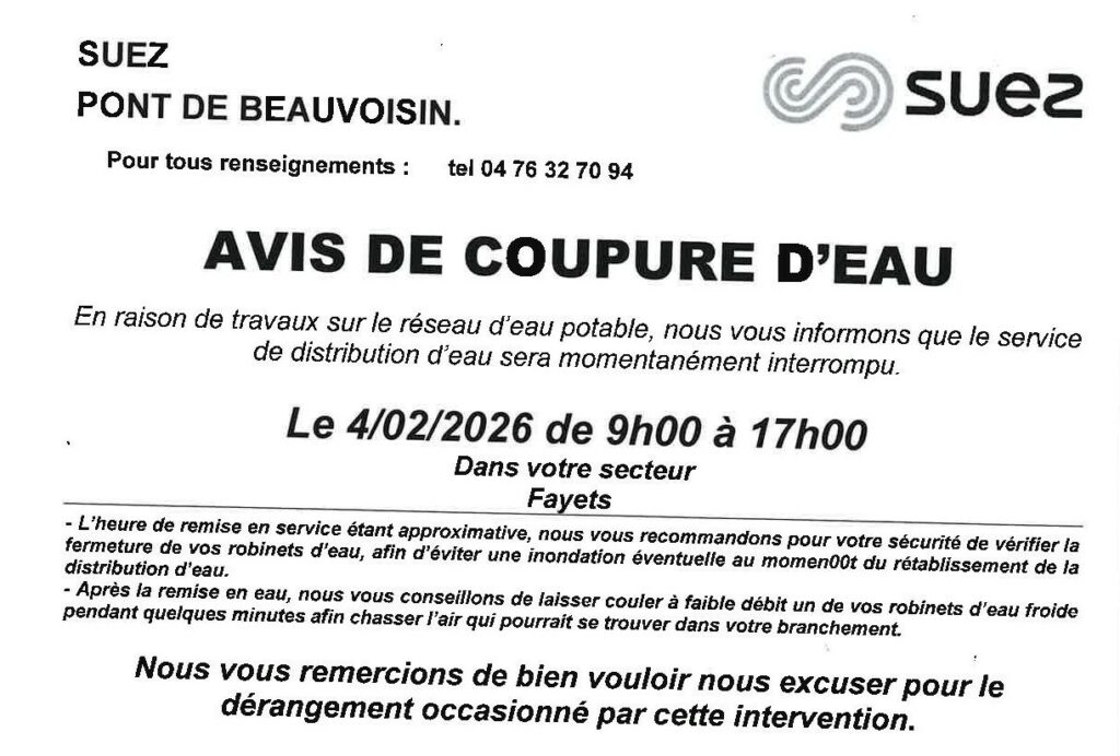 Voici l’avis de coupure d’eau sur le secteur des Fayets communiqué par Suez  💦