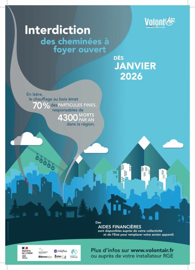 L’Isère fait un nouveau pas dans la lutte contre la pollution de l’air. Après un premier arrêté préfectoral en octobre 2024 interdisant les appareils de chauffage au bois les plus polluants dans les communes de Grenoble Alpes Métropole, du Grésivaudan et du Pays voironnais, l’interdiction est étendue. A compter du 1er janvier 2026, les appareils de chauffage à foyer ouvert sont interdits d’utilisation dans les 36 communes des Vals du Dauphiné, ainsi que dans les 139 communes de Bièvre Est, Bièvre Isère Communauté, le Trièves et Saint-Marcellin Vercors Isère.