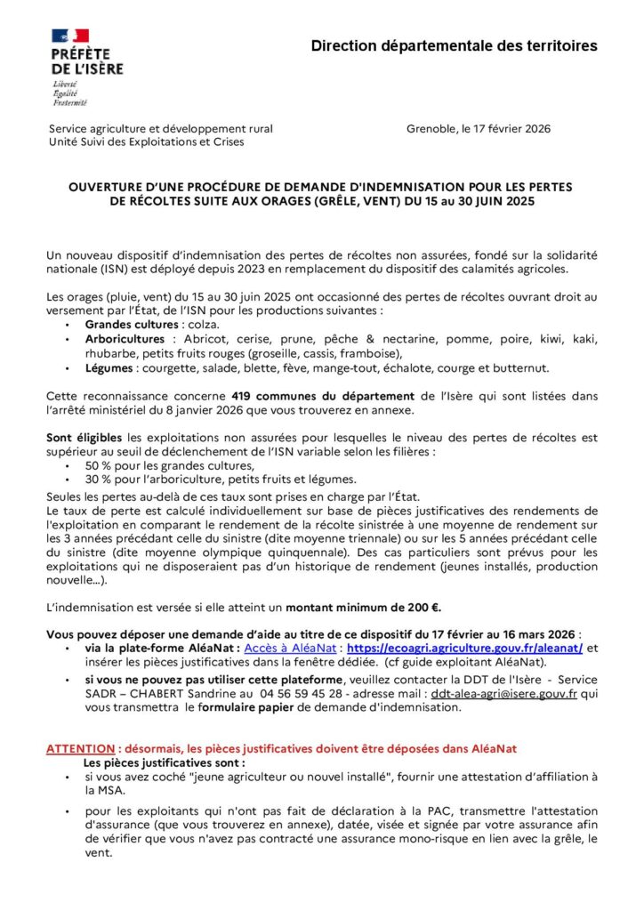 Les demandes d’indemnisation se font par le biais de la téléprocédure AléaNat ouverte du 17 février au 16 mars 2026. Les agriculteurs devront se rendre sur la plateforme AléaNat :