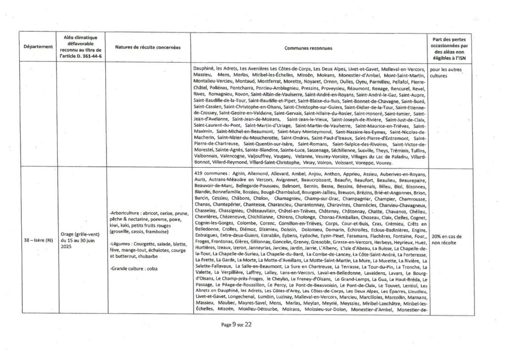Voici une copie de l’arrêté ministériel de reconnaissance initiale pour les pertes de récoltes sur colza, abricot, cerise, prune, pêche et nectarines, pomme, poire, kiwi, kaki, rhubarbe, petits fruits rouges (groseille, cassis, framboise); courgette, salade, blette, fève, mange-tout, échalote, courge, butternut, suite aux orages (pluie et vent) du 15 au 30 juin 2025 sur votre commune.