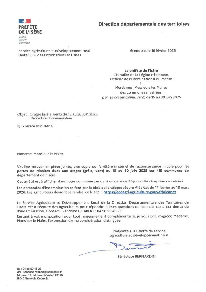 Voici une copie de l’arrêté ministériel de reconnaissance initiale pour les pertes de récoltes sur colza, abricot, cerise, prune, pêche et nectarines, pomme, poire, kiwi, kaki, rhubarbe, petits fruits rouges (groseille, cassis, framboise); courgette, salade, blette, fève, mange-tout, échalote, courge, butternut, suite aux orages (pluie et vent) du 15 au 30 juin 2025 sur votre commune.